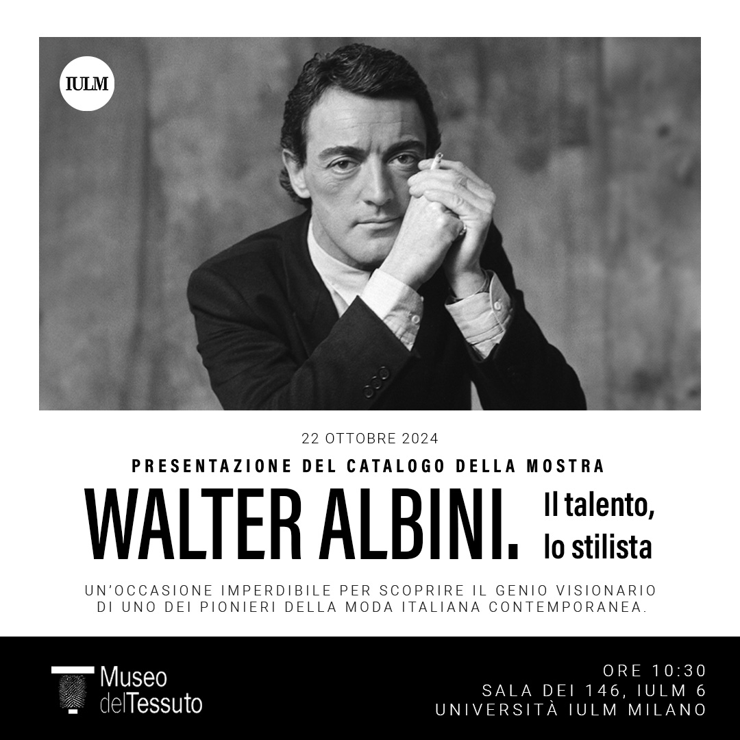 Il 22 ottobre, alle ore 10:30, nella Sala dei 146 dell’Università IULM, saranno presentati il catalogo e la mostra “Walter Albini. Il talento, lo stilista” curati da Daniela Degl’Innocenti (storica del tessuto e conservatrice del Museo del Tessuto) ed Enrica Morini (storica della moda e docente IULM), che ripercorrono la vicenda creativa e professionale dello stilista il cui ruolo è stato fondamentale nell’avvio del prêt à porter italiano e del Made in Italy. All’evento, moderato dal Prof. Mauro Ferraresi, interverranno le curatrici, insieme a due degli autori: Bianca Cappello (storica del gioiello), che parlerà dei bijoux di Albini, e Antonio Mancinelli (giornalista e docente IULM), con un focus sulla sua moda maschile.