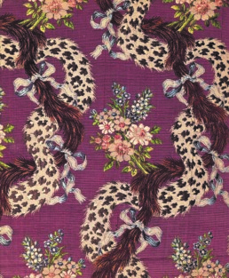 Uno dei nostri tessuti è presente nella sezione dedicata alle evocazioni dalla fauna ed alla tendenza dell'animalier. Si tratta di uno splendido cannellato broccato in seta, di manifattura francese della fine del Settecento, con un pattern che rappresenta pellicce intrecciate in sinuosi meandri, alternate a mazzi di fiori, secondo un gusto eclettico molto gradito all'epoca. Le pelli ed i manti animali in questo periodo diventano di gran moda, evocando i trofei di guerra e di caccia, le scoperte di manufatti di luoghi lontani e selvaggi che tanto cominciano ad attrarre l'interesse delle società di corte europee.