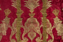 These fabrics were used to make sumptuous secular robes for the aristocracies of the time. Thanks to their enormous prestige and value, they were later donated to religious institutions that reused them to make sacred vestments such as chasubles, dalmatics, copes: an extraordinary custom of reuse that allowed the conservation of textile masterpieces, some wonderful examples of which are displayed for the public in the exhibition.