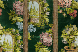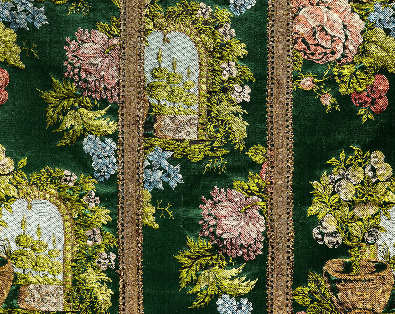 During the century, fabrics and luxury goods imported to Europe by the East India Companies as simple souvenirs became models to be imitated for their unusual colour palettes, accentuated naturalism and unusual composition of decorations. This time it was France that led the tastes of European textile manufacturers, thanks to the reforms applied to the luxury goods sector by Louis XIV and his Minister Colbert.