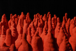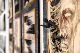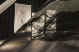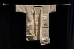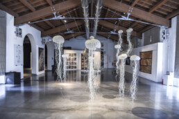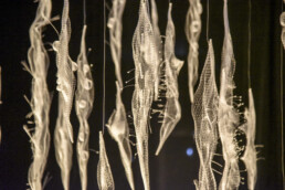 Lana, seta, cotone diversamente manipolati secondo la sensibilità dei vari artisti, si uniscono a materiali di diversa composizione – carta, cera, metallo, bambù – per dare luogo ad oggetti tridimensionali che come delle vere e proprie sculture si ergono negli spazi del Museo oppure calano dall’alto come veli leggeri che fluttuano nello spazio, accanto ad arazzi che sembrano delle vere e proprie opere su tela.
