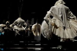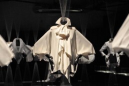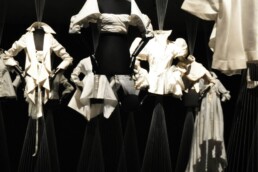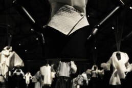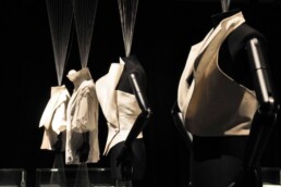 L’incipit della mostra è affidato ad un sistema sospeso di teli su cui scorrono macro immagini dei disegni autografi di Ferré, lampi perfetti che delineano la sua visione creativa e che rappresentano la chiave per accedere all’universo insito a ciascun progetto. Macro-installazioni fotografiche (simulazioni x-ray), di una selezione dei capi esposti, restituiscono l’impalcatura formale e materica di ciascuna camicia e mettono in evidenza texture e l’anima stessa della camicia.