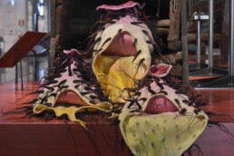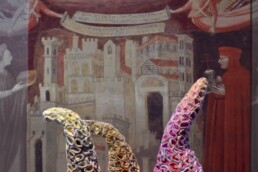 Le opere rappresentano l’espressione del subconscio dell’artista e rispecchiano la fascinazione per il mondo naturale. Il suo immaginario prende vita attraverso fantasiose installazioni che assumono forme di creature surreali morbide e allungate, sospese oppure alla ricerca della terra, cariche di colori cangianti dalle infinite sfumature che richiamano i fenomeni naturali.