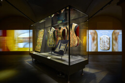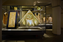 Utilizzati per la confezione di sfarzosissime vesti laiche destinate alle aristocrazie del tempo, questi tessuti, per il loro enorme pregio e valore, venivano successivamente donati a istituzioni religiose che li riutilizzavano per realizzare paramenti sacri come pianete, dalmatiche, piviali: una straordinaria pratica di riuso che ha permesso la conservazione di capolavori tessili di cui la mostra presenta al pubblico alcuni meravigliosi esemplari.