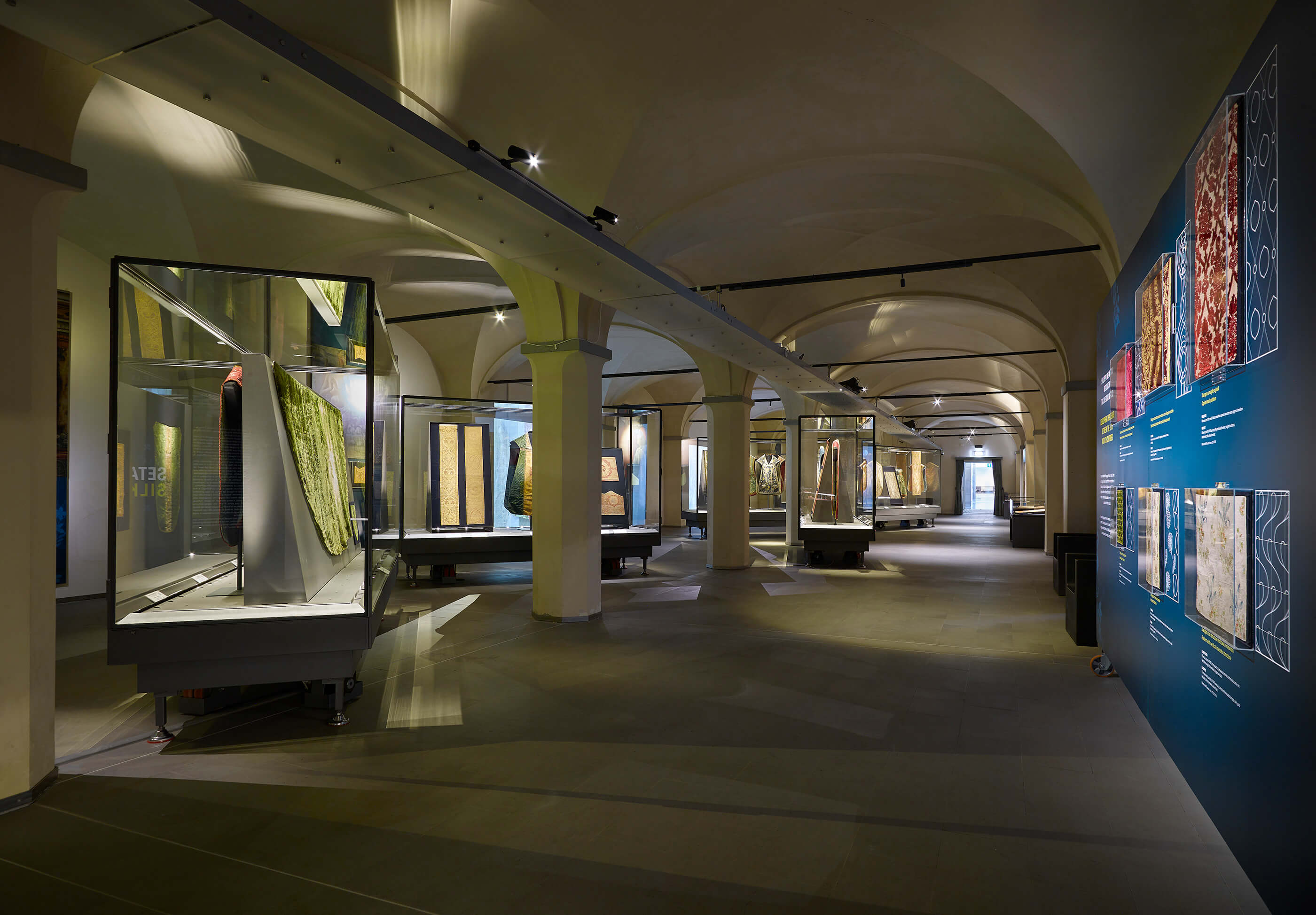 Per facilitare la comprensione di contenuti storici e tecnici, la sala espositiva è dotata di due apparati multimediali che raccontano, con metodi e linguaggi diversi, il processo di lavorazione del tessuto e lo sviluppo dell’arte della seta fino al periodo preindustriale. Microscopi digitali consentono di osservare da vicino la struttura interna e la complessità degli intrecci di velluti, damaschi, broccati e lampassi (tessuti in seta operata). Infine, riproduzioni grafiche affiancate ai tessuti, illustrano lo sviluppo dei principali motivi decorativi adottati dalle botteghe tra XV e XVIII secolo. Le riproduzioni di alcune importanti opere pittoriche affiancate a tessuti dello stesso periodo, rendono immediatamente visibili le diverse funzioni di questi preziosi capolavori in seta.