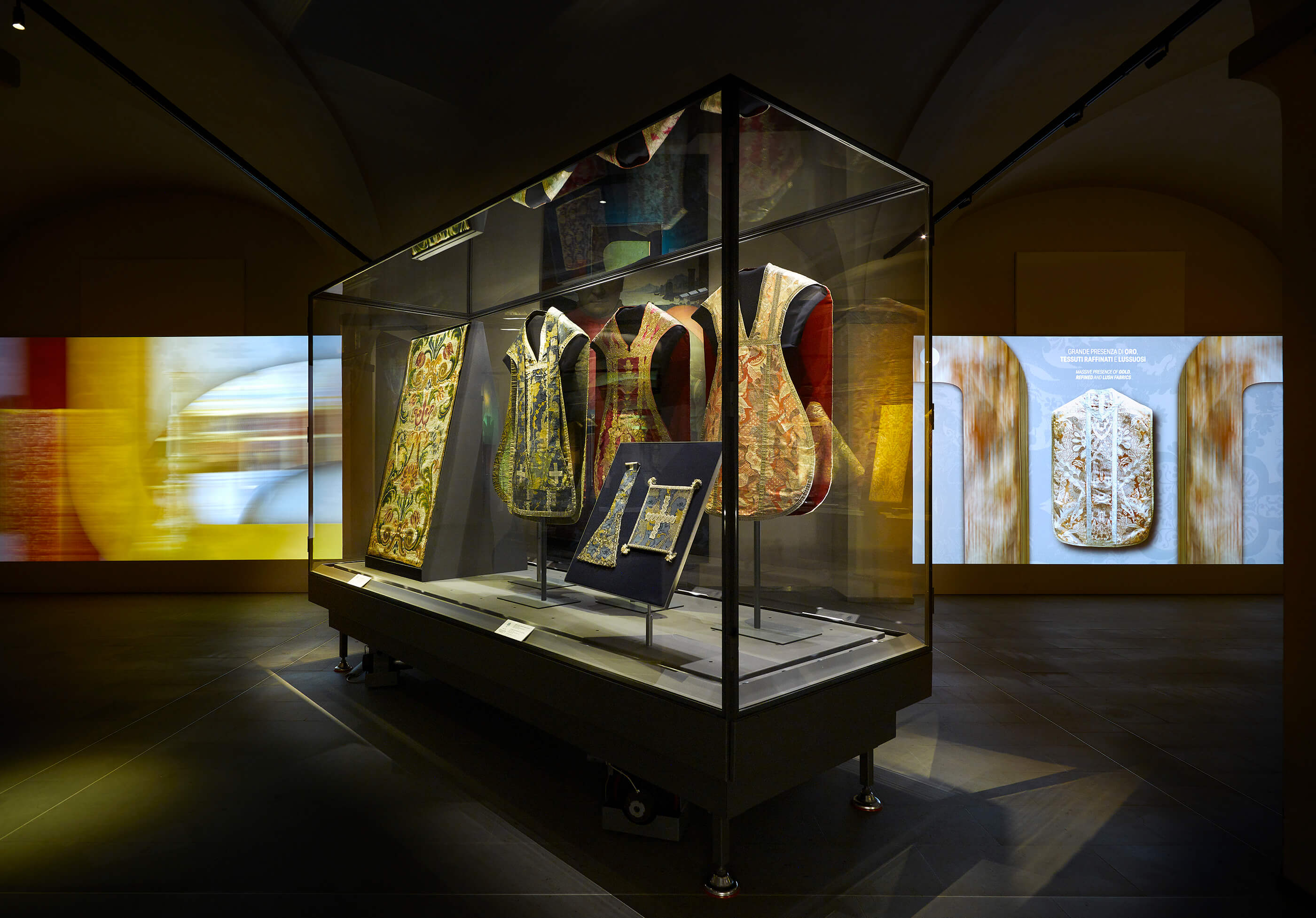 Utilizzati per la confezione di sfarzosissime vesti laiche destinate alle aristocrazie del tempo, questi tessuti, per il loro enorme pregio e valore, venivano successivamente donati a istituzioni religiose che li riutilizzavano per realizzare paramenti sacri come pianete, dalmatiche, piviali: una straordinaria pratica di riuso che ha permesso la conservazione di capolavori tessili di cui la mostra presenta al pubblico alcuni meravigliosi esemplari.