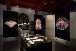 L’incipit della mostra è affidato ad un sistema sospeso di teli su cui scorrono macro immagini dei disegni autografi di Ferré, lampi perfetti che delineano la sua visione creativa e che rappresentano la chiave per accedere all’universo insito a ciascun progetto. Macro-installazioni fotografiche (simulazioni x-ray), di una selezione dei capi esposti, restituiscono l’impalcatura formale e materica di ciascuna camicia e mettono in evidenza texture e l’anima stessa della camicia.