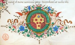 A metà del Quattrocento, l’adozione da parte di famiglie notabili di “imprese” già codificate dalla tradizione, trova un utilizzo sempre più ampio e variabile secondo il contesto. A Firenze, con Lorenzo il Magnifico, questa moda d’influenza francese viene accolta con grande entusiasmo. Alcune delle imprese medicee, già adottate da Cosimo il Vecchio e dai figli Piero e Giovani – l’anello con la punta di diamante, il falcone, il pavone e la rosa (emblema dei Visconti e poi degli Sforza) – conoscono con Lorenzo un uso più libero e fantasioso soprattutto esibito in occasioni pubbliche di massima visibilità. Di questo è testimonianza la famosa giostra tenutasi a Firenze nel 1469, dove tutti i partecipanti descritti nella cronaca vestono i colori della livrea medicea e anche gli emblemi sugli stendardi, mescolati a figure allegoriche, celebrano la casata e la persona del Magnifico. Nella cronaca si ricorda che sullo stendardo di Lorenzo è rappresentato un “broncone” (tronco d’alloro, suo personale emblema) attraversato da un tralcio di rose, fiore incluso nello stemma di Clarice Orsini, sua futura consorte. Al momento competizione Lorenzo non manca di dare sfoggio dell’amicizia con i reali di Francia togliendosi il mantello con i colori medicei e presentandosi con una veste azzurra gigliata d’oro. Alla luce di questa testimonianza anche i due velluti del museo si leggono come documenti fedeli di questa nuova e diffusa tendenza che viene recepita da tutte le corti italiane del Rinascimento mentre agli stemmi veri e propri viene assegnata una funzione di alta ufficialità e di rappresentanza di tipo giuridico.